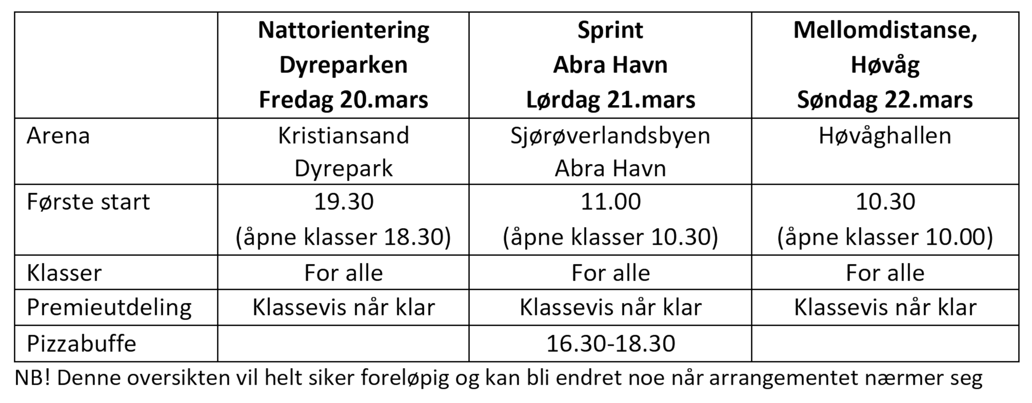 Nattorientering i Kristiansand Dyrepark fredag 20.mars, Sprintløp i Abra Havn og Juliusskogen lørdag 21.mars før helgen avsluttes med mellomdistanse i Høvåg med Arena i Høvåghallen.